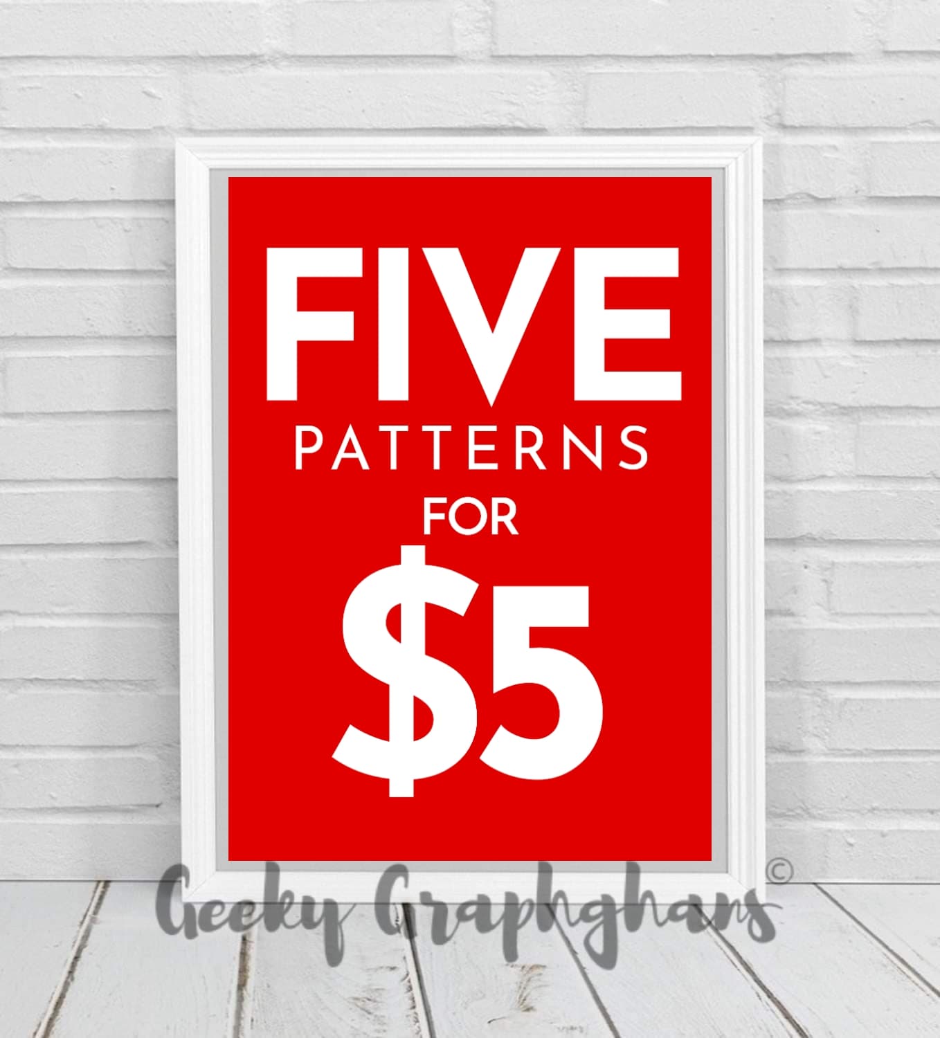 Five awesome patterns, one amazing price. Five mystery patterns in one easy download. Designed exclusively for Geeky Graphghans; this pack of five brand new, previously unreleased graphghan patterns is available to download for just $5 right now!! Don't miss out; this offer ends at midnight Sunday.